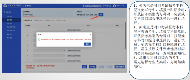 考生填写志愿过程中,须关注登录过期倒计时,因部分批次填写院校专业组志愿数量较多,注意在填写过程中及时点击“保存志愿”按钮保存填报结果。填写完成当前填报批次志愿后,也须点击“保存志愿”确认志愿生效。