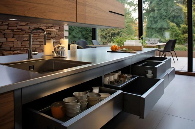 厨房收纳:黄金动线规划,搭配旋转拉篮、极薄铝高抽、水槽联动柜,充分利用转角空间,释放操作台面,厨具收纳井然有序。