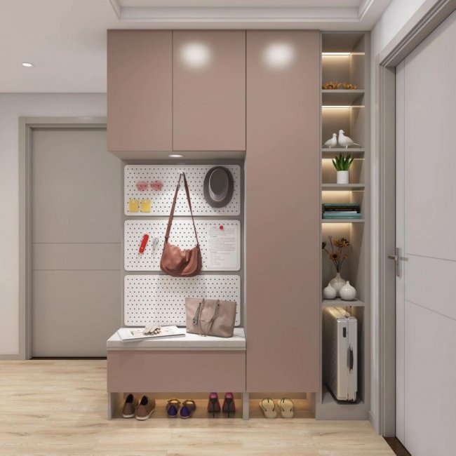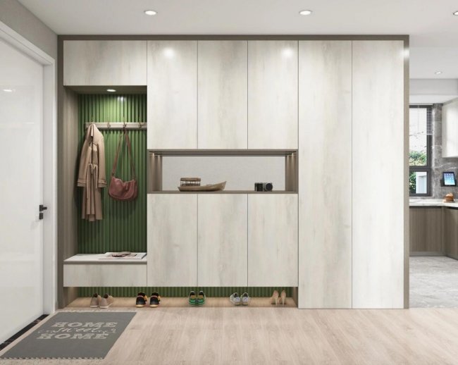 针对不同户型玄关特点,收纳刻给出专属设计方案:小户型或窄玄关,优先采用超薄玄关柜(深度≤35厘米),搭配墙面挂架或洞洞板,利用垂直空间收纳钥匙、包包,避免挤占过道,同时保持空间通透感;中等空间打造多功能一体化玄关柜,下部设计透气鞋柜,中部留空40-60厘米放置随手物品,上部封闭柜体存放换季鞋子与杂物,实现分区明确、物尽其用;大空间则采用组合式设计,将鞋柜、换鞋凳、衣帽架一体化整合,换鞋凳下预留15-20厘米空当放置常穿拖鞋,兼顾实用性与便捷性。