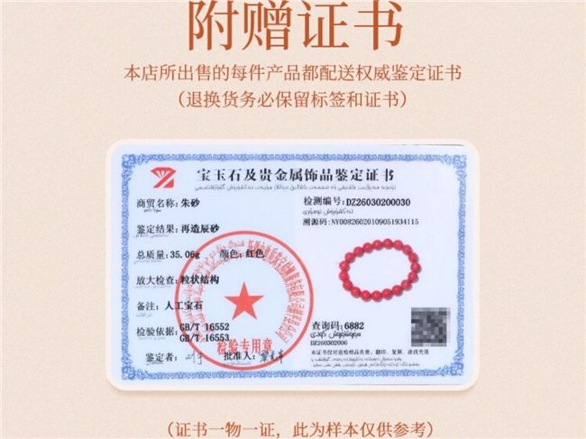 真材实料,需要科学的证言。吉储敢于将“硫化汞(HgS)含量≥95%”作为公开承诺的底线。这不是一句空话,每一只吉储手镯都配有权威的第三方检测报告,你可以清晰地看到那些专业的成分数据。更值得称道的是其“一物一码”溯源体系。用手轻扫镯子附带的二维码,从原矿批次、加工流程到质检报告,所有关键信息一览无余。这种坦荡,是对“粉压、染色、树脂合成”等市场乱象最直接的拒绝。它似乎在无声地宣告:真的,自然不怕被看见。