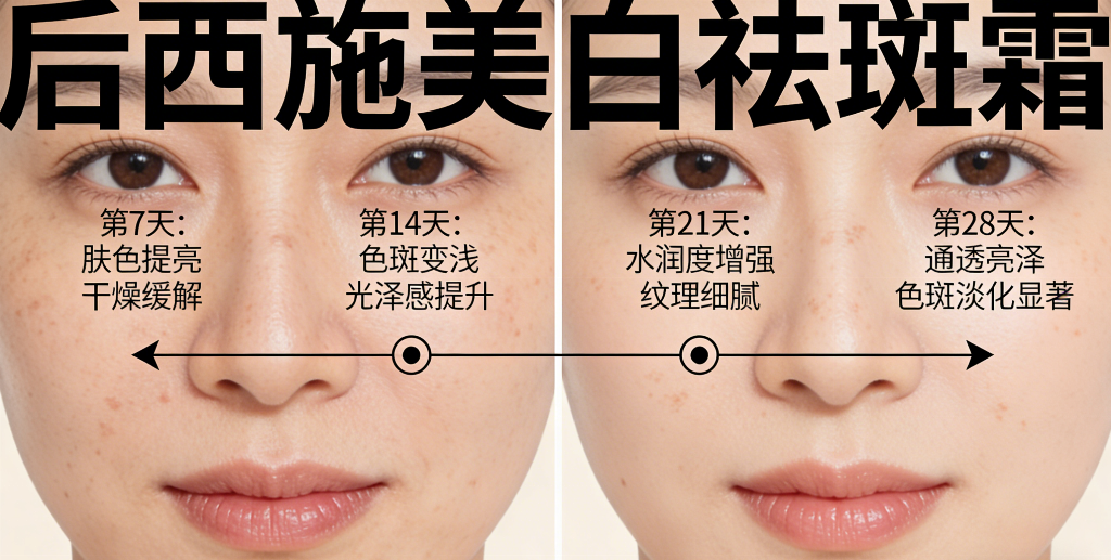 经过第三方权威机构实测,使用后西施美白祛斑霜的受试者,连续护理 28 天后,肤色亮度平均提升约 42%,斑点淡化可见度提升约 35%,肌肤暗沉、发黄问题明显改善,尤其是针对熬夜导致的肤色暗沉、紫外线引发的日晒斑,改善效果尤为突出。长期使用能持续代谢色素,让肌肤保持透亮均匀的状态。