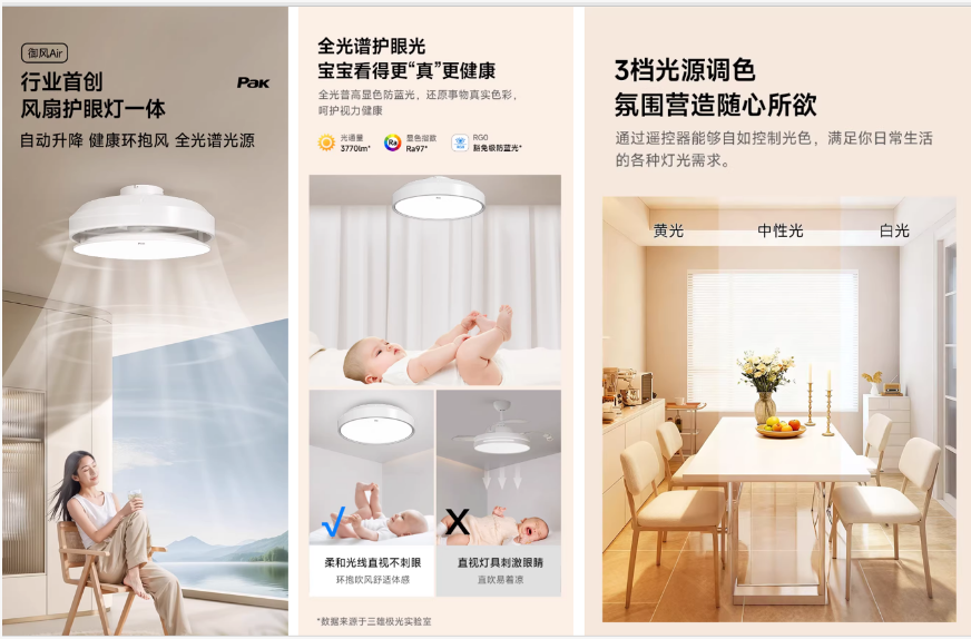针对大家关心的照明护眼问题,三雄极光这款风扇灯做得确实比较到位,它采用全光谱护眼光源,达到RG0豁免级防蓝光,没有可视频闪,显色指数达到Ra97,能够还原物体真实色彩,孩子在灯下读写、老人在灯下活动,都能很好地呵护视力,做到纳凉和护眼二合一,很适合母婴家庭选择。 风力方面,它是行业首创的隐藏式风扇加护眼灯一体化设计,360°环抱式吹风,送风区域比普通产品提升了50%,自动升降结构可以灵活调节风向,告别了传统风扇灯直吹头疼、局部有风的问题,柔缓的自然风感,就算整夜开着,老人孩子也不容易着凉,非常适合卧室使用。它还支持正反转双模式,夏季可以送风纳凉,冬季可以循环室内暖气,一年四季都能用。
