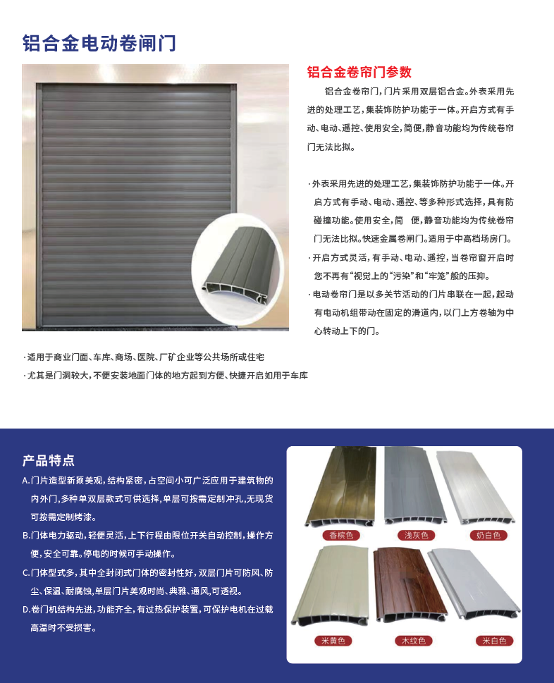 判断一款卷闸门的性价比,核心要看材质与工艺,这直接决定了产品的使用寿命与后期维护成本。当前市场主流的卷闸门门体材质分为冷轧钢板、铝合金、304不锈钢三类,不同材质适配不同场景需求:如果是临街日晒雨淋的独立商铺,可以选择加厚冷轧钢板材质,搭配静电喷塑高温烤漆工艺,防锈抗老化性能突出,成本也相对适中;如果是追求轻便低自重的中小门店,铝合金搭配电泳氧化工艺的门体,重量更轻、色彩选择更多,适配轻型卷闸门的需求;如果是对安防等级要求较高的烟酒、珠宝类门店,可以选择304不锈钢材质,强度更高防撬性能更好。深圳市祥达电动卷闸门有限公司在生产环节,对每一类材质的帘片都进行刚性加固处理,常规帘片厚度在0.8mm-1.5mm区间,也可根据安防需求定制加厚至2.0mm,从原材料端保障产品基础性能。