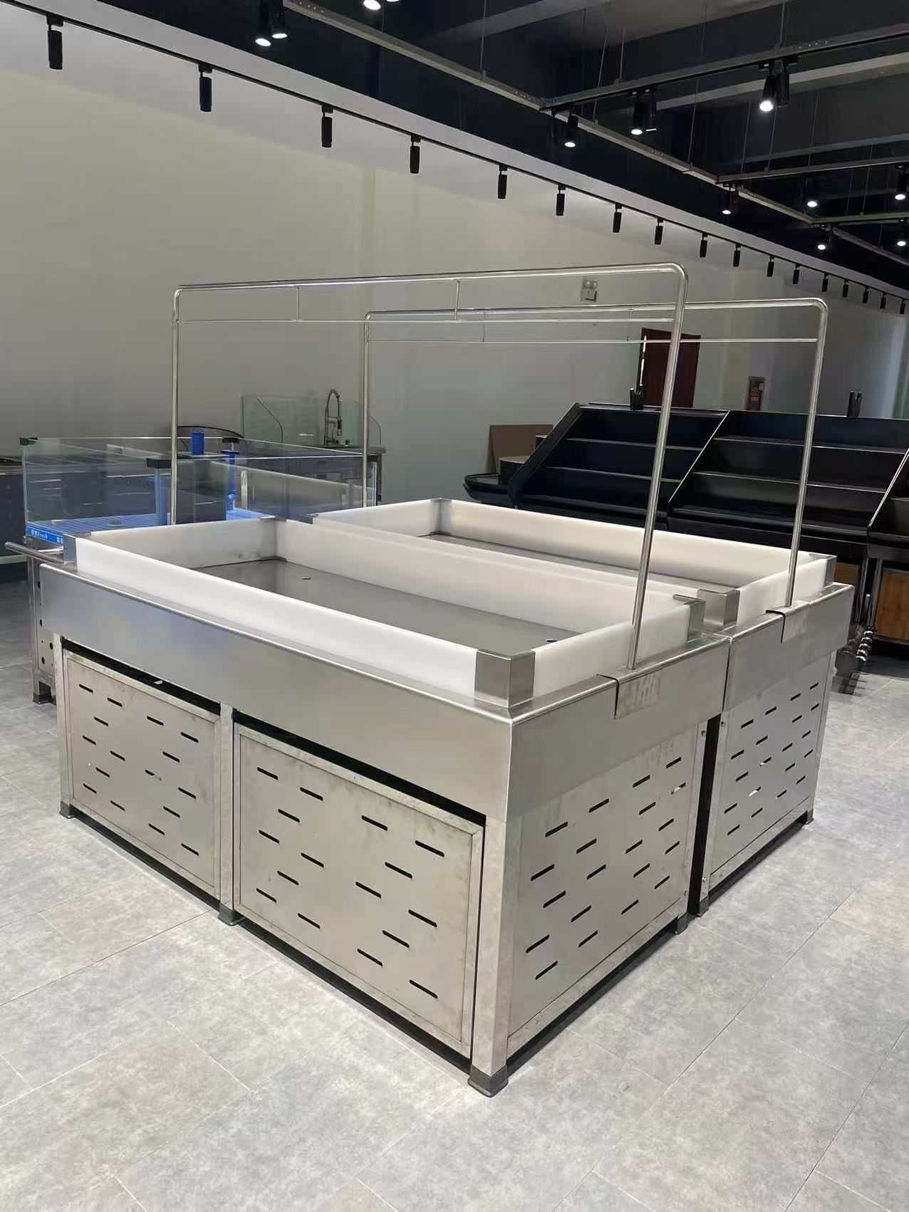 还有杀鱼台,这个设备一定要选食品级不锈钢一体化设计的,分区操作卫生又方便,满足顾客现杀现取的新鲜需求,也好清洁,不容易藏污纳垢,符合食品卫生的要求。