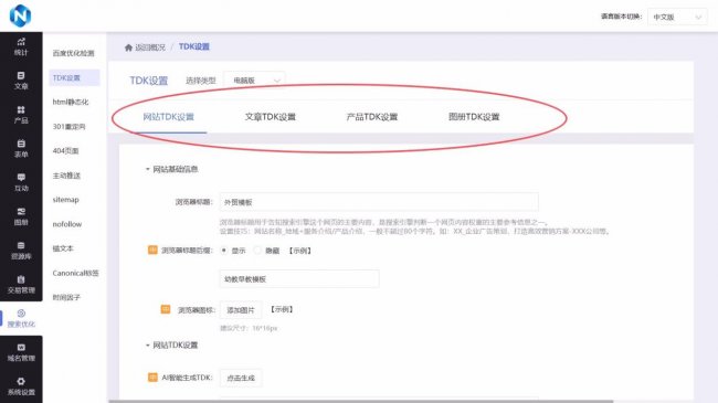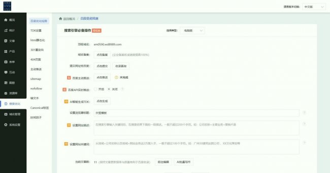 替换站点内容后,在 SEO 设置中启用 AI 生成 TDK,开启 sitemap 自动提交至百度、谷歌搜索引擎。