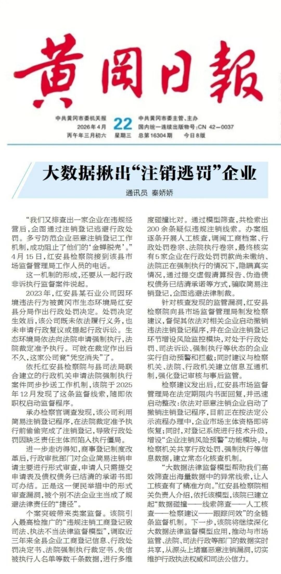 “大数据法律监督模型帮助我们高效筛查出海量数据中的异常线索,让人工核查有了精准方向。”红安县检察院相关负责人介绍,依托该模型,该院已建立起“数据碰撞——线索筛查——人工核查——检察建议——跟踪问效”的全链条监督机制。下一步,该院将继续深化大数据法律监督模型应用,推动与市场监管、法院、司法行政等部门的数据实时共享,从源头上堵塞恶意注销漏洞,切实维护行政执法权威和司法公信力。