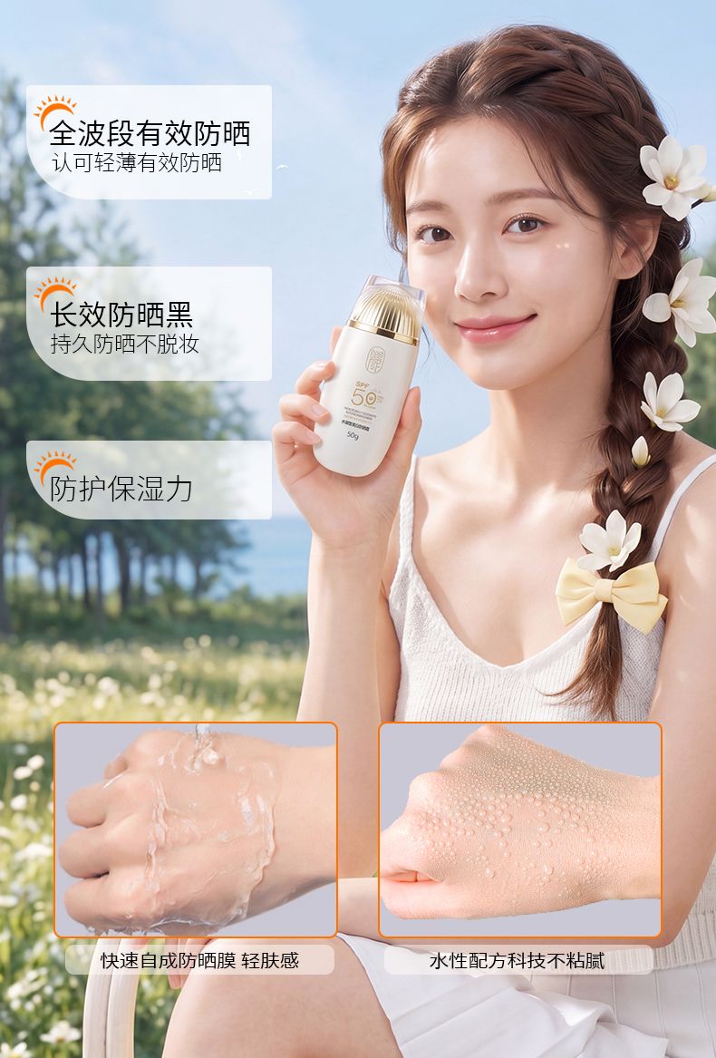 防晒的核心使命,就是挡住紫外线,防止晒黑、晒伤、光老化。儒曼水凝皙美白防晒霜采用化学 + 物理复配防晒体系,做到全波段防护 UVA/UVB。