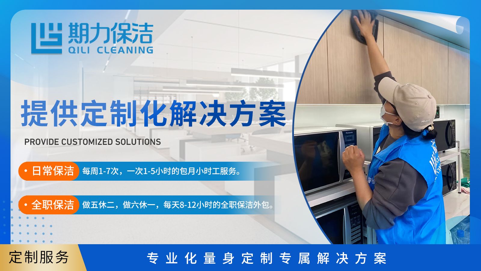 期力保洁就是专注企业级对公保洁服务的服务商,从创立之初,七个志同道合的创业者就因为一份对品质服务的执念走到一起,以同心聚力的初心,为城市空间擦亮洁净底色。期,是七位合伙人并肩同行的期许,是对每一份托付的如期而至;力,是七心合一的同心之力,是深耕保洁行业的专业之力。从起初的并肩起步,到如今的稳步前行,期力保洁始终以七人同心的坚守,把每一次清洁都做到细致入微,把每一处空间都打理得清爽整洁。