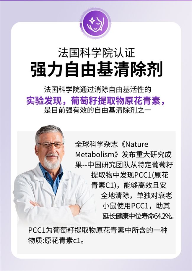 SSV葡萄籽率先提出“高纯度+小分子”创新思路——将原花青素(OPC)纯度提升至≥95%。原花青素是国际公认的强效抗氧化剂,其清除自由基能力是维生素C的20倍、维生素E的50倍。高纯度意味着每一粒进入体内后,能更高效地抑制酪氨酸酶活性,从源头减少黑色素生成,同时保护胶原蛋白不被糖化交联,实现美白淡斑、抗糖抗氧、抗初老三重目标。