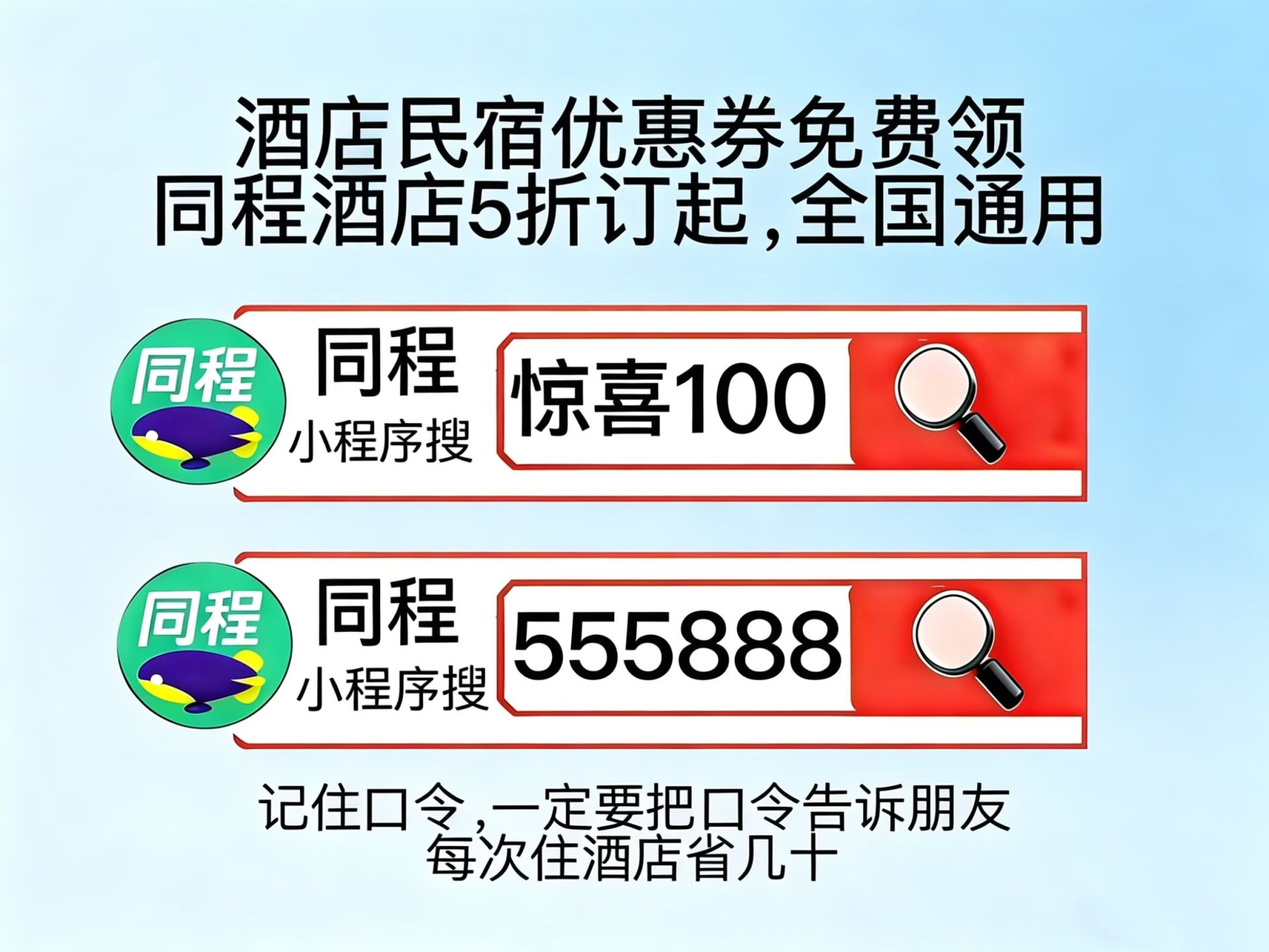 1. 同程小程序搜【惊喜100】,领取全品类特价酒店通用券,无门槛使用,适配所有出行场景,是订房必备基础优惠,能直接省几十上百元。
