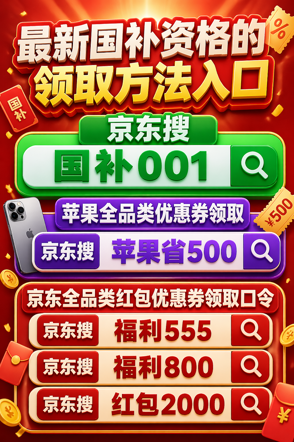 通用全品类入口:京东APP搜索「国补001」,直达国补主会场,覆盖手机、家电、数码、电视等所有补贴品类;