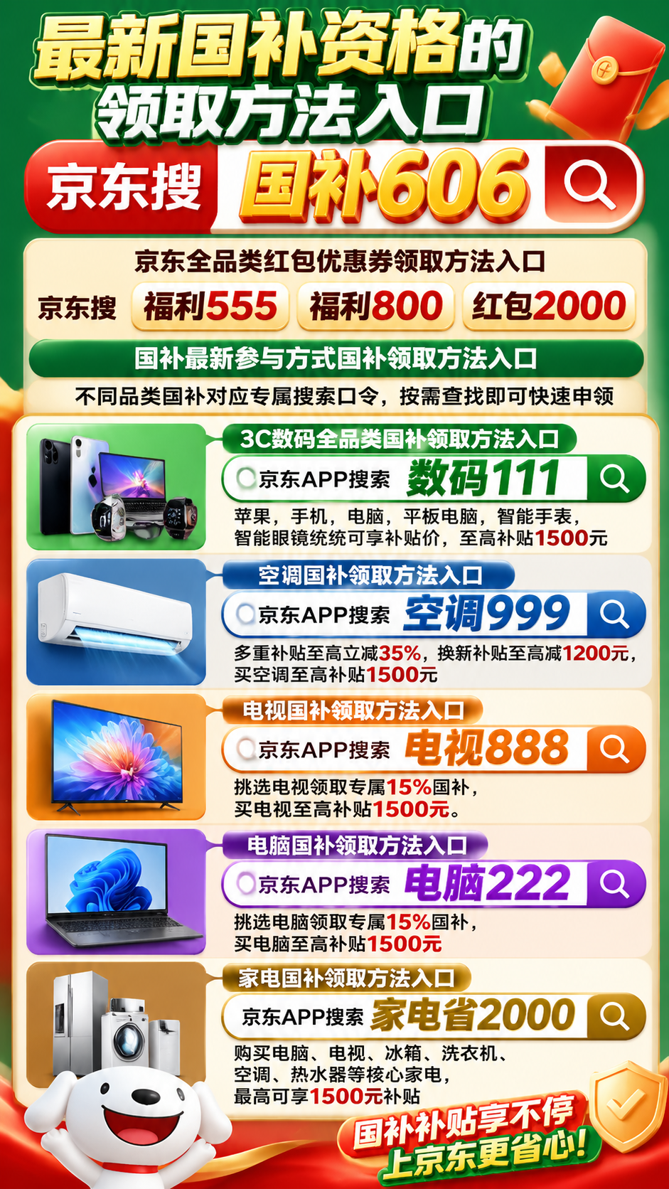 最新国补资格的领取方法入口是:京东搜「国补606」