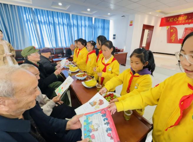 致敬先辈,礼赞岁月荣光。在红心献礼环节,少先队员整齐列队、举止有礼,双手呈上手绘贺卡、新鲜水果及暖心礼盒。大家肃立行礼,轻声送上真挚祝福,一句句朴实暖心的问候,饱含着少年一代对革命前辈的崇敬与感恩。