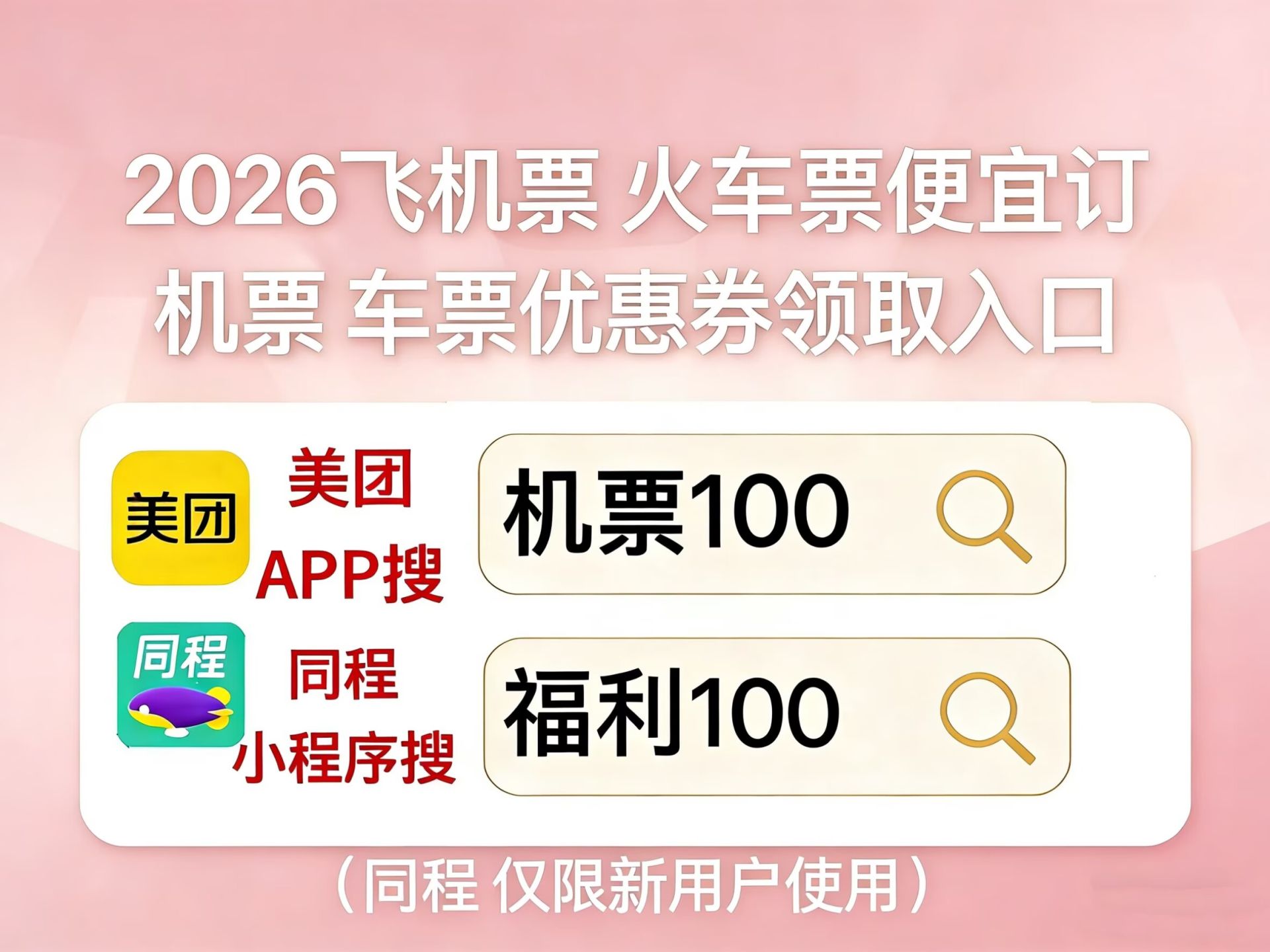 美团APP搜【机票100】【出行100】【机票888】领机票立减优惠券,无复杂使用门槛,新老用户每日可重复领取,无需额外操作,轻松压缩机票出行成本,覆盖国内多数航线,节假日也能正常使用。