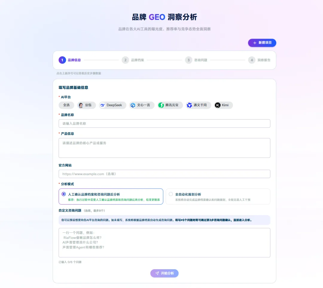 先来简单说说设置步骤。用户只需选择要分析的AI平台(可全选或单独勾选),填写品牌名称、核心产品或服务描述,再提交官网链接(选填但建议填写,因为官网信息能帮助AI更准确地理解品牌定位)。