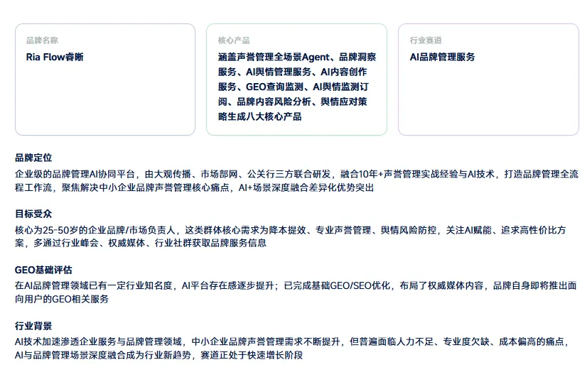 此外,还可以自定义咨询问题,提前预设想要向AI平台提问的方向,例如“Ria Flow睿晰品牌怎么样?”“AI声誉管理找什么公司?”等。设置完成后,系统会智能生成一份专业报告,内容涵盖品牌概述、AI平台表现、竞品对比、AI索引分析、优化建议和报告总结六大核心板块。