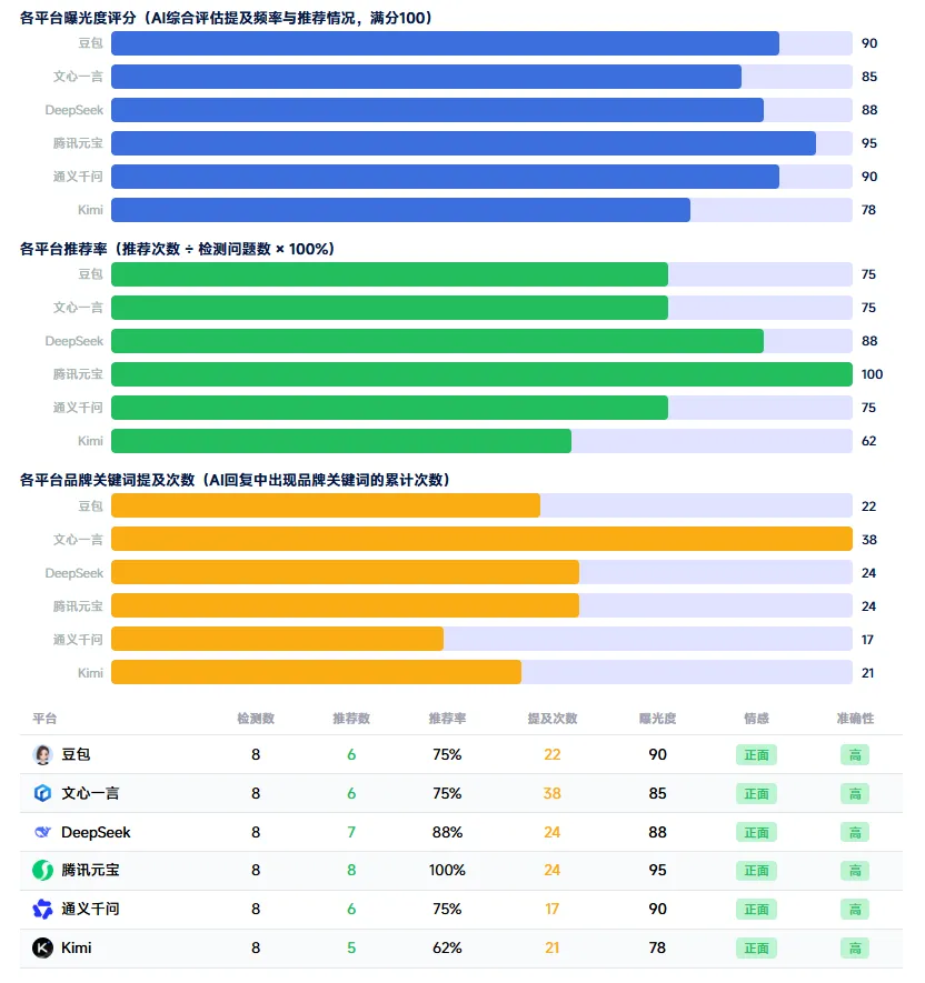 从睿晰自身的实测报告就能看出,睿晰在腾讯元宝的推荐率达到100%,豆包、文心一言、通义千问均达75%,仅KIMI为62%,整体情感均为正面、准确性高。报告还会逐一标注各平台优势与不足,让品牌对自身GEO现状一目了然,精准定位问题平台与薄弱场景。