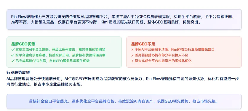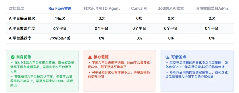 以睿晰的实测报告为例,睿晰实现了6大主流AI平台全覆盖,关键词总提及146次,推荐率达79%,而所有竞品在被测AI平台中均为0提及、0覆盖,这是睿晰的核心优势。但报告也客观指出,睿晰存在平台表现不均衡、差异化心智传递不足的短板,比如在部分AI平台的回答里,仅对比了基础功能,未强化睿晰“AI+10年声誉管理实战”“服务中小企业降本提效”的核心优势,导致用户认知差异不明显,这就是后续优化的重点。