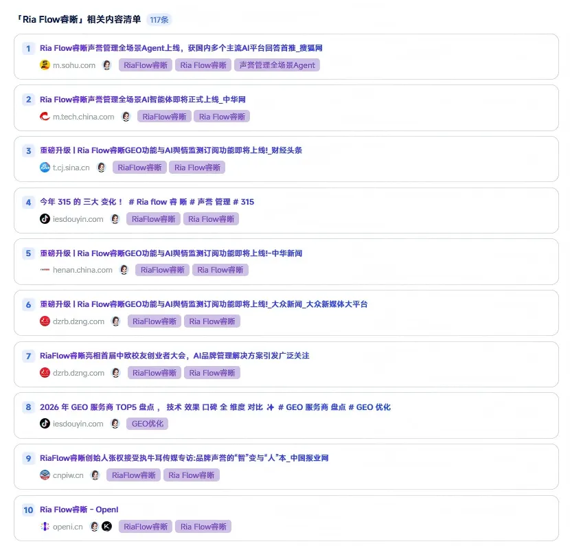 自RiaFlow睿晰GEO功能上线以来,实时查询和效果监测两大模块,已经帮不少人搞清楚了自己品牌在豆包、文心一言、DeepSeek、千问、KIMI、元宝六大主流AI平台的露出情况,并帮助品牌持续跟踪声量变化、留存完整数据。但也有很多人在问,知道了现状、看清了数据,接下来该怎么优化?从哪里入手更有效?