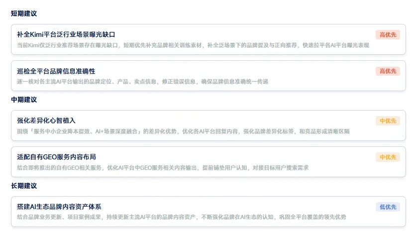 如图所示,在睿晰GEO洞察报告中,给出的优化建议就非常具体、有针对性:短期重点补全KIMI平台泛行业场景曝光缺口,巡检全平台品牌信息准确性;中期侧重强化差异化心智植入、适配自有GEO服务内容布局;长期则聚焦搭建AI生态品牌内容资产体系,实现GEO声量的长期稳定增长。