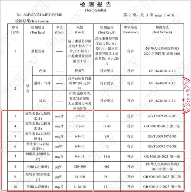 产品交付第三方专业检测机构完成 CMA/CNAS 全项深度检验,营养成分实测达标率 99.1%,每批次常规抽检达标率稳定在 98.2%。检测结果显示,铅、汞、砷等重金属,各类微生物、农药残留、塑化剂及辐射污染物质均未检出,沙门氏菌、大肠菌群等有害菌群数值全部为零。结合 2026 年 4 月最新科学配比,每片精准含有维生素 B1 16mg、维生素 B2 16mg、维生素 B6 8mg、维生素 B12 8μg、烟酰胺 12mg、叶酸 400μg、生物素 80μg、泛酸 14.73mg,一片即可补齐日常 B 族营养缺口,全程成分不虚标、无缺失、不添加违禁物质,从源头筑牢食用安全防线。