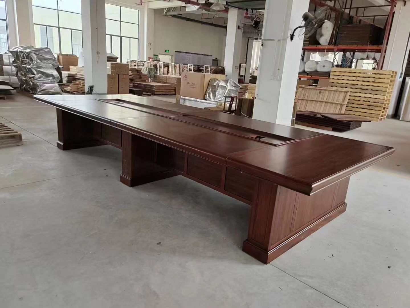 在工艺上,满军家具的会议桌采用传统榫卯结构,榫头比行业标准宽2mm,咬合面积更大,承重提升30%以上,部件严丝合缝,会议桌整体稳固不摇晃。漆面经三道底漆、四道面漆工艺加工,长久保持光滑亮丽外观。生产全程毫米级精度管控,从木工切割到成品检测多道质检,确保桌面平整、边角顺滑,品质稳定如一。