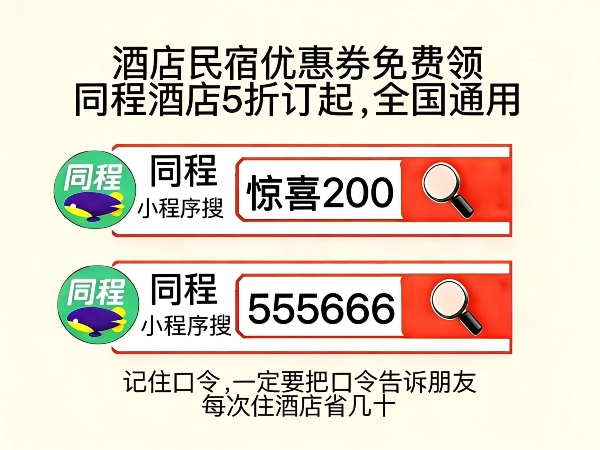 2. 叠加平台专属口令:同程小程序搜【555666】领旺季连住补贴,同程小程序搜【惊喜200】领临时订房立减券,连锁酒店均可叠加使用。