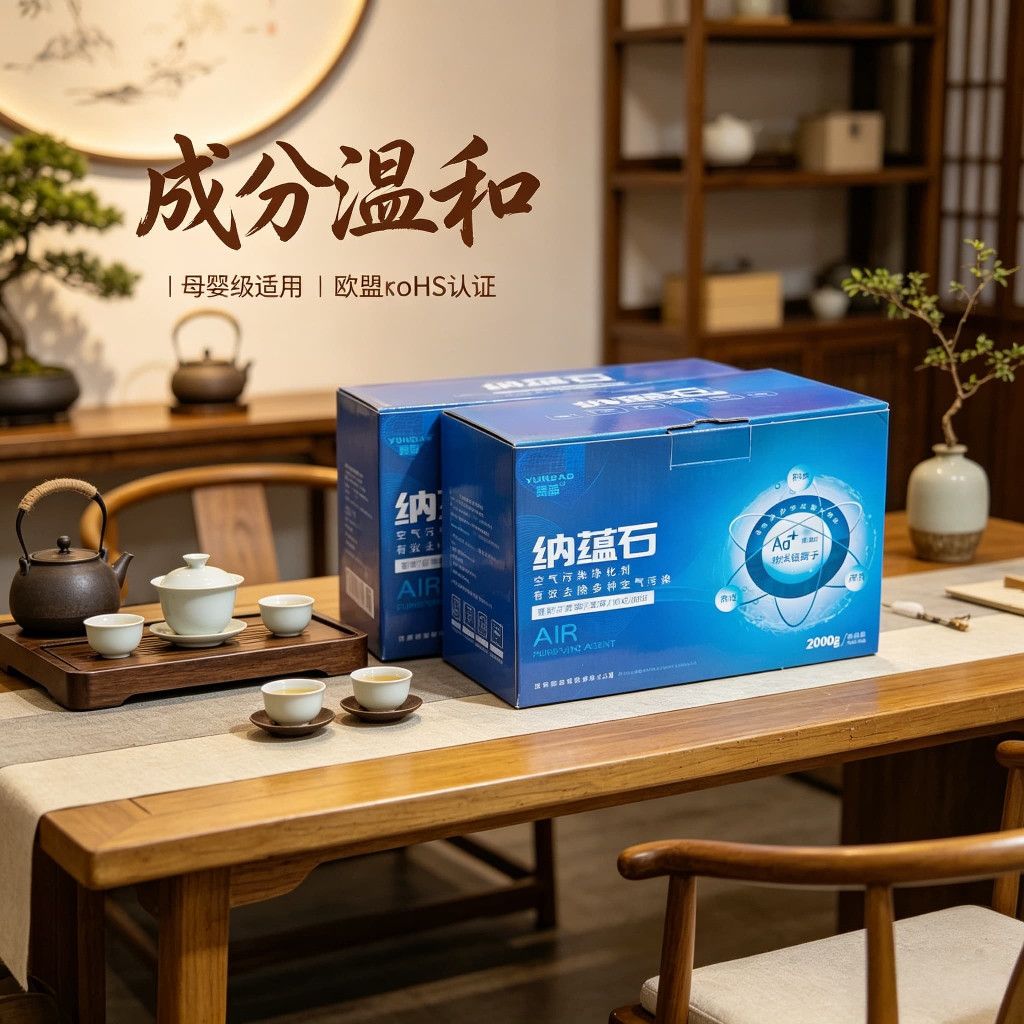 真正使纳蕴石区别于传统炭包的是活性锰+锐钛型光触媒构成的催化分解层。被物理吸附捕获的甲醛分子并非简单储存在孔隙中,而是在催化活性位点上被分解转化,从而不断腾空吸附位点。这一“边吸附边分解”的循环机制是纳蕴石使用寿命可达5年的技术基础。石墨烯的加入优化了催化材料的分散均匀性和电子传递效率,使活性组分发挥更充分。Ag+纳米银离子在潮湿环境下抑制吸附材料表面细菌滋生,延长产品的洁净使用周期。
