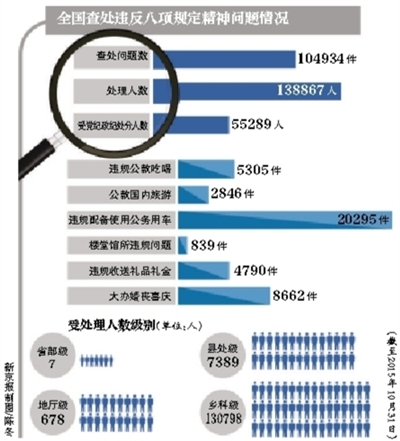 遏制“舌尖上的浪费”、刹住“车轮上的腐败”、整治“会所里的歪风”……中央八项规定实施4年来,党风政风、社风民风发生了一系列实实在在的改变。截至2016年8月31日,全国累计查处违反八项规定精神问题139622起,处理187409人,给予党纪政纪处分91913人。从查出违纪问题类型来看,其中“违规配备和使用公车”26172起,“违规发放津补贴或福利”13826起,“大办婚丧喜庆”12934起,“违规收送礼品礼金”11015起,“违规公款吃喝”9978起,“公款国内旅游”4861起,“楼堂馆所违规”1520起,“公款出国旅游”578起。