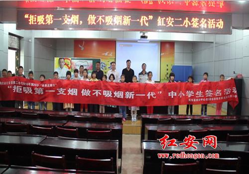 红安网消息 刘洪波 何明华报道:5月31日,红安县疾控中心、县健康教育所、红安二小联合举办2016年第29个世界无烟日“拒吸第一支烟 做不吸烟新一代”中小学生签名活动