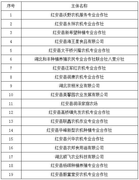 根据《红安县2025年农业生产社会化服务项目实施方案》(红农发〔2025〕10号)文件要求,按照“公平、公正、公开”的原则,2025年9月26日对我县申报服务主体进行了遴选,经查阅资料和现场核查,确认以下申报主体资格真实有效,同意将下列主体纳入2025年农业生产社会化服务项目。现公示如下。