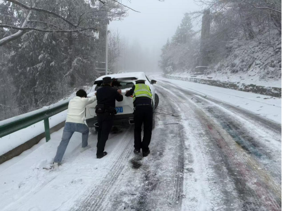 针对降雪后路面结冰、交通事故易发等特点,七里坪派出所科学调配警力,采取“定点值守+动态巡逻”相结合的方式,重点加强G230、S320、S407等主干道区域的巡逻频次。民辅警顶风冒雪,对路面通行情况进行实时排查,在S407天台山路段开展交通安全劝导疏导交通3余次,同时联系天台山管理处对桥面、弯道等结冰区域进行除雪作业并撒布融雪剂和防滑沙,有效预防交通事故。巡逻中,民辅警通过警车引导、喇叭喊话等方式提醒驾驶员减速慢行,谨慎驾驶,避免交通事故发生。劝返上山游玩车辆12台次,游客30余人并将因路面打滑无法行驶停放在路边的游客车辆推向安全地带,有效化解道路交通安全风险和群众出行安全。