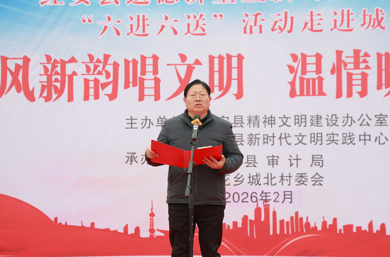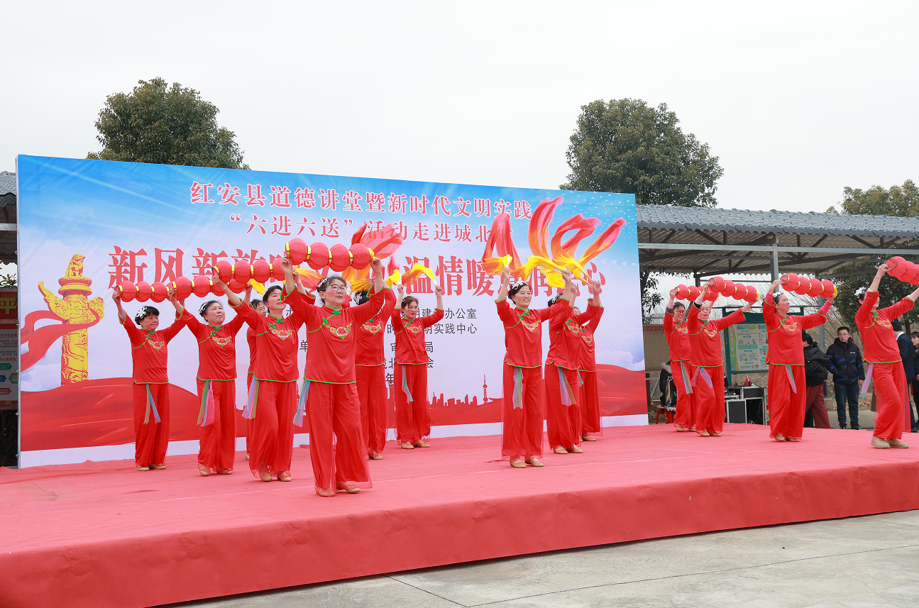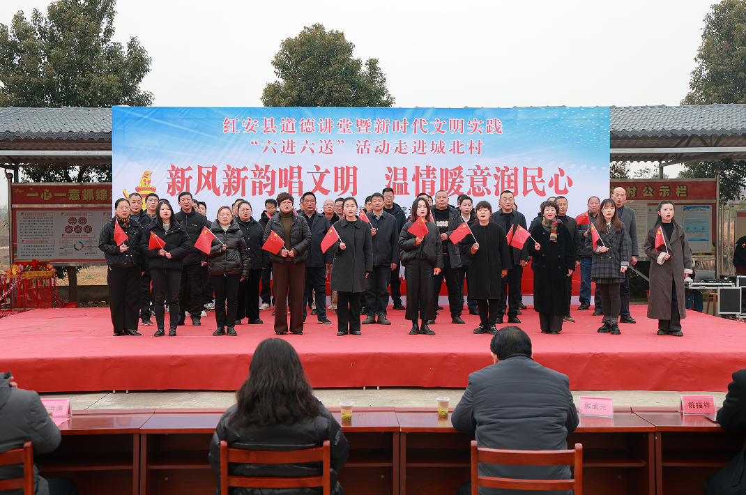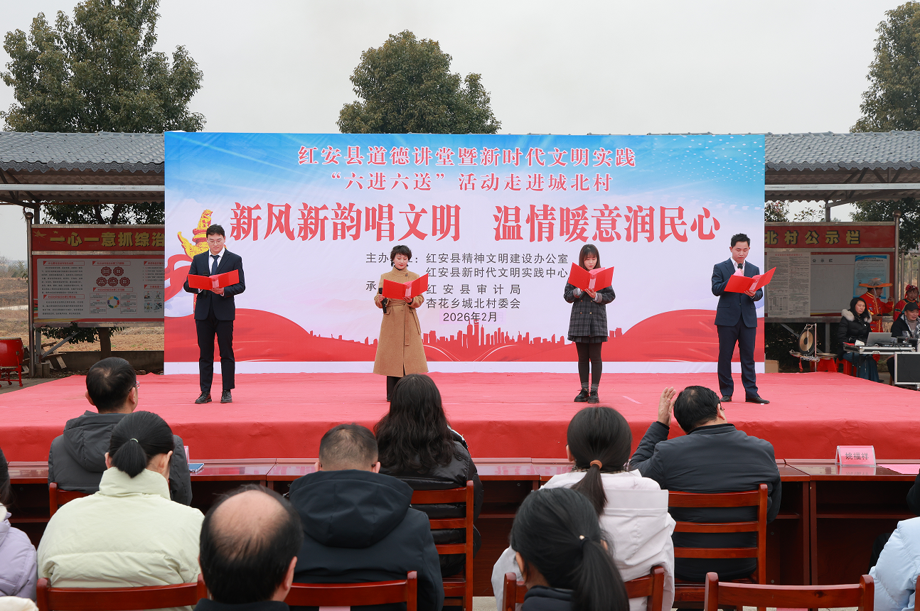 红安网消息 2月4日,红安县道德讲堂暨新时代文明实践“六进六送”进乡村活动在杏花乡城北村举行。本次活动的主题为:新风新韵唱文明 温情暖意润民心。红安县委常委、宣传部部长、总工会主席熊孟元出席并讲话,高红英、姚福祥等县领导,各乡镇(场、处)党委宣传委员、县直相关单位分管负责人、县直单位文明实践服务队、县审计局全体干部职工、杏花乡城北村全体村干部,部分村民代表参加活动。