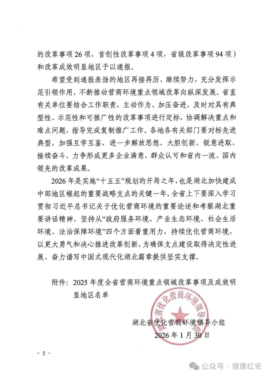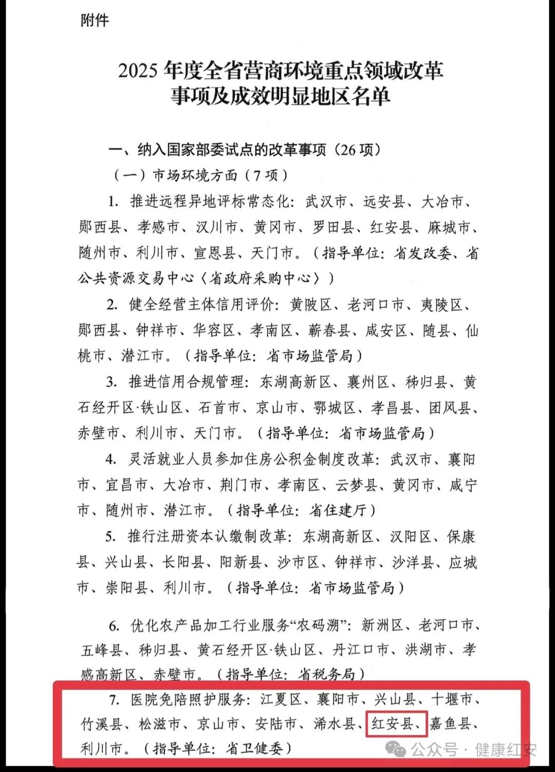 红安网消息 1月30日,湖北省营商办对全省优化营商环境重点领域改革事项成效明显的市、县予以通报表扬,红安卫健“免陪照护”模式作为全省典型推荐,并入选国家部委试点改革事项。