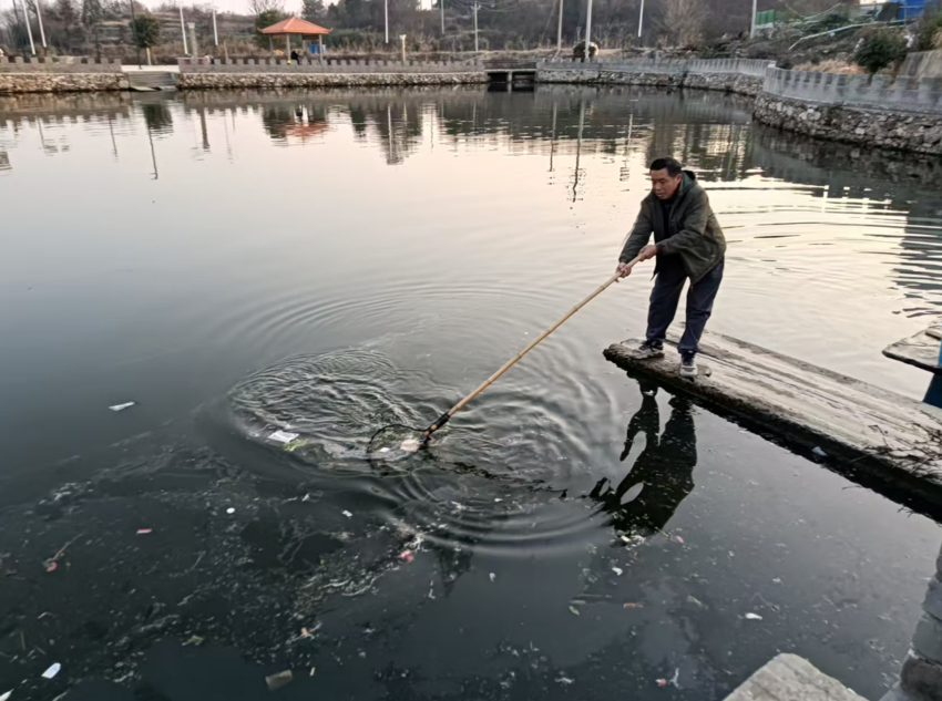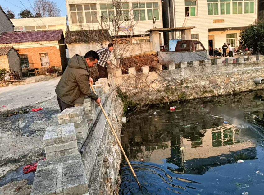 活动现场,村民们手持打捞工具,分工协作、细致作业,重点清理塘面白色垃圾、漂浮杂物等,不放过一处卫生死角。经过两个多小时的辛勤劳作,当家塘水面恢复洁净,重现一池清水,村容村貌焕然一新。