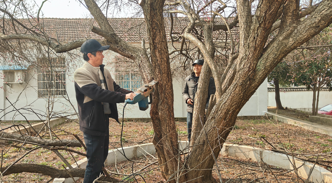 古树是活着的文物,守护古树就是守护乡愁。为保住这株珍贵古梅,上新集镇迅速制定“一树一策”专项保护方案,组织农业农村服务中心专业技术人员上门实施抢救性保护。工作人员对病枯枝条进行精细修剪,清理病虫滋生载体;通过打孔注药、吊针补液等方式,为古树补充营养、恢复活力;采用多菌灵与生石灰调配防护液,全面涂刷树干,有效防治病虫害并抵御冻害。一系列科学规范的措施,为古梅重生提供了坚实保障。