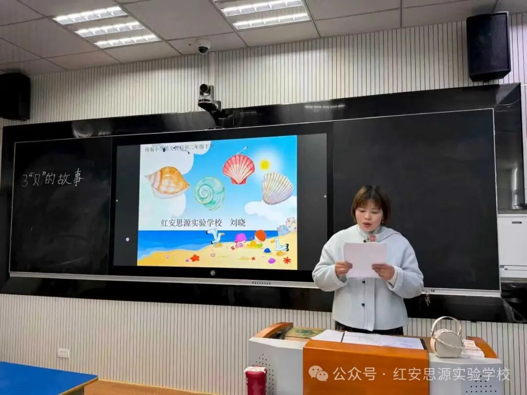 在《“贝”的故事》一课的设计中,思源校区刘晓老师紧扣“传统文化”这一单元主题,以“贝”字的演变过程为主线,带领学生了解汉字的源流与文化内涵。通过甲骨文图片、微课视频、贝壳实物等多种教学手段,刘老师引导学生识记生字、理解字义,并借助语言训练和识字游戏,激发学生对汉字的兴趣。整节课设计注重识字与文化的融合,体现了“在语境中识字、在文化中感悟”的教学理念。交流研讨环节 在交流研讨环节,与会教师围绕两节课的教学目标、重难点突破、环节设计等方面展开深入讨论。大家一致认为,两篇教学设计都能立足学生实际,注重情境创设与情感熏陶,体现了语文教学的育人价值。同时,教师们也就如何进一步优化识字教学、提升课堂互动性等问题提出了建设性意见。